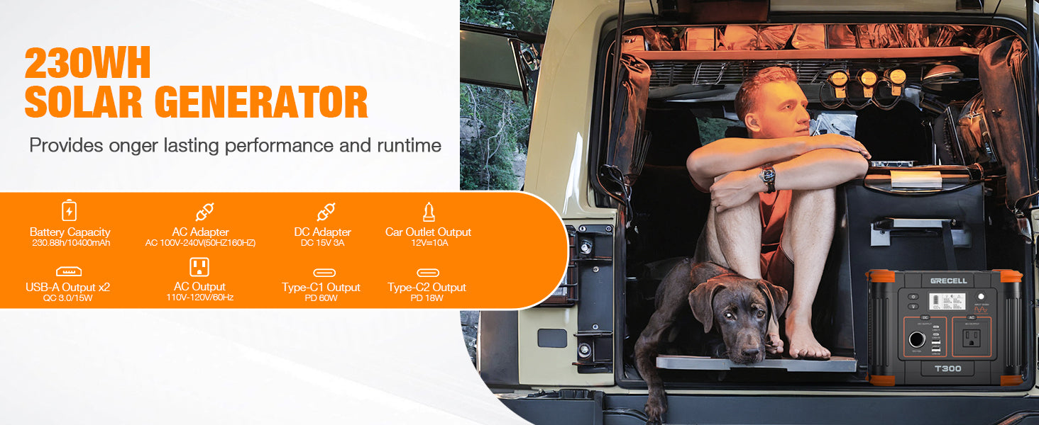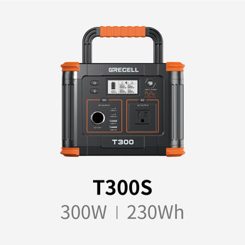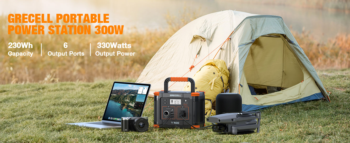 GRECELL T300S, a compact and versatile energy solution for outdoor adventures, travel, and emergencies. With a 230.8Wh capacity and 330W output, it powers laptops, phones, lights, and more. Enhanced with advanced safety features and rapid charging capabilities, it can charge up to eight devices simultaneously. Rechargeable via AC, solar panel, or car outlet, it's the perfect companion for any journey.